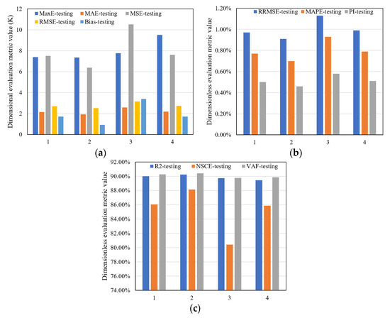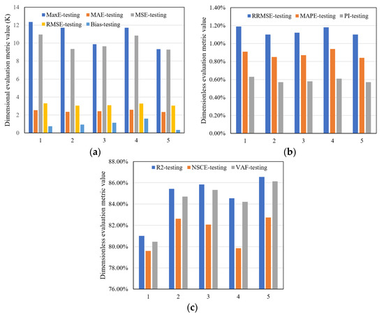 A comprehensive assessment of the performance of the proposed machine learning model for regression prediction is essential. A vast range of evaluation metrics are used to conduct such assessments. The capability of the proposed model can be determined by accurately calculating the values based on the predicted and observed values in the dataset. In this study, 13 evaluation metrics were used: maximum residual error (MaxE), mean absolute error (MAE), mean squared error (MSE), mean absolute percentage error (MAPE), root mean squared error (RMSE), normalized root mean squared error (NRMSE), coefficient of determination (R2), relative root mean squared error (RRMSE), bias, performance index (PI), variance-accounted-for (VAF), Nash–Sutcliffe coefficient of efficiency (NSCE), and Akaike information criterion (AIC). It is worth noting that R2, NRMSE, RRMSE, MAPE, NSCE, VAF, and PI are dimensionless. By indicating the observed value and the mean observed value for soil temperature in the dataset applied in this study as and , the value and the mean value predicted by the model proposed in this study for soil temperature as and , the number of data in the dataset as , the number of input climatic features as , and the fit line coefficients derived from the linear trend line as and , the evaluation metrics are defined as follows: