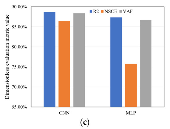 Evaluation metrics calculated for the two-layer 1D CNN model in its testing phase, (a) MaxE, MAE, MSE, RMSE, and bias, (b) RRMSE, MAPE, and PI, (c) R2, NSCE, and VAF.