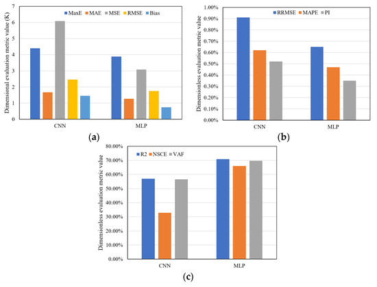 Evaluation metrics of the 1D CNN model vs. the MLP model in very cold weather conditions, (a) MaxE, MAE, MSE, RMSE, bias, (b) RRMSE, MAPE, PI, (c) R2, NSCE, VAF.