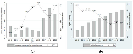 We calculate the average and the coefficient of variation of the entrepreneurial competencies and digital economy of 286 cities in China, as shown in Figure 1.