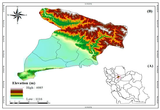 Alborz Province (B) of Iran (A) is illustrated using a digital elevation model (DEM).