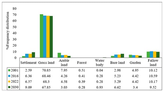 The settlement areas increased between 2001 and 2016 because of the economic, political, and geographical location of the province. Therefore, this trend will continue until 2030. The bare lands will expand due to the reduction in water resources. Additionally, forest land, which occupies about 0.39% of the study area, will be destroyed by 2030 because this type of land is situated close to urban-rural-industrial areas and bare land. The greatest change is related to the settlement areas, with 3.97% growth between 2001 and 2022. In recent years, residential and industrial areas have grown more than other land-use types because of the growth in urbanization and the development of industrial areas along with immigration. The highest decrease is related to arable land and grass land, with a decrease of −3.36% and 2.55%, respectively (Figure 2).