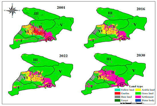 According to Figure 3, most of the area is covered by Grass land, which is concentrated in the north and southwest, followed by Arable land in second place, with approximately 10%. The highest growth in settlement areas is related to cities IV, V, II, and VI, respectively, and this trend continues in the next 8 years for cities II and VI.