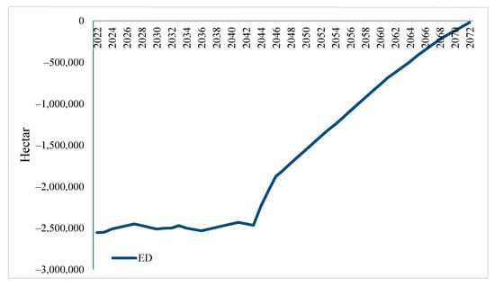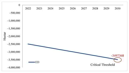 The difference between the BC and EF allowed for the quantification of the ECC and the definition of the environment state, referred to as ecological deficit, ecological reserve, or ecological balance. The ecological deficit is a concept that describes how the region’s environment is exploited quantitatively. The amount of environmental deficit shows whether or not the area exceeded its biological capacity levels. An area can be described as a ‘deficit area’ when the ecological footprint exceeds its biological capacity []. In this study, the concept of ecological deficit was used to determine the sustainable economic structure []. The ecological deficit is the most common and most straightforward mathematical indicator with relative and ecological comparison goals. This index is much more efficient than other methods for calculating ecological sustainability. Indeed, the ecological deficit is an indicator for finding the optimal value of objective functions, which includes linear constraints based on variables (ecological footprint and biological capacity) [,].