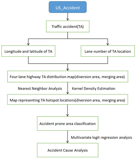 After confirming that accidents conform to the law of aggregation, the kernel density estimation method was applied to calculate and draw a density map of traffic accidents. Finally, in order to evaluate the distribution pattern of traffic accidents, we used the multivariate logit regression model to find the causal factors of differences in frequent accident locations and determine the explanatory variables that cause changes in the location of accidents. The flowchart of this study is shown in Figure 1.