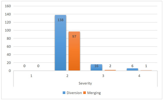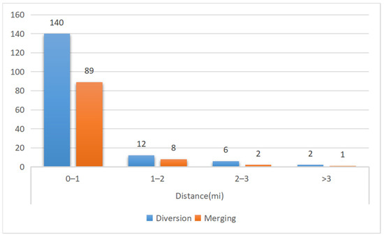 The selected data include 160 accidents in the diversion area and 100 accidents in the merging area. The statistical distributions of the parameters “Severity” and “Distance” are shown in Figure 3 and Figure 4. It is observed obviously that most of the accidents belong to Severity 2 and the impact scope of the accidents is within 0–1 miles.
