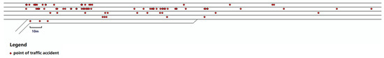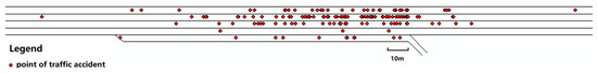 According to the traffic accident database, the following characteristics were used to identify the accidents that happened in the highway merging and diversion areas: latitude and longitude, description, and junction. The selected data were marked on a standard four-lane highway diversion area and a merging area through ArcGIS, as shown in Figure 5 and Figure 6. Since the accident points selected in this paper are all near the joint (the corresponding data field is “joint = true”), the distribution of accidents on the map is within approximately 200 m of the ramp.