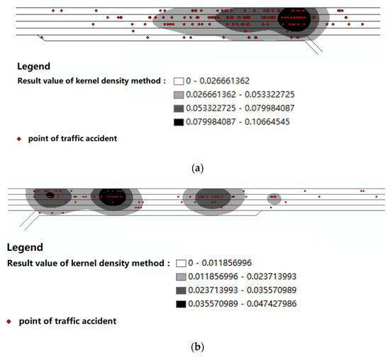 Kernel density analysis result of diversion area and merging area. (a) Diversion area; (b) merging area.
