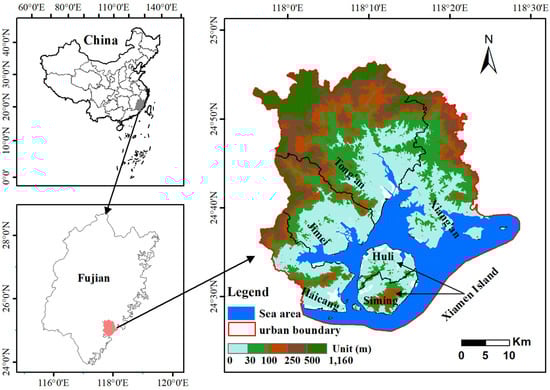 Figure 1 shows that Xiamen City is located in the Fujian Province of China between 117°53′ and 118°26′ East and 24°23′ and 24°54′ North. It is one of the first four special economic zones established in China and obtained many honors, such as “the Habitat Scroll of Honor Award of the United Nations” and “the International Awards for Livable Communities “. It covers a land area of 1700.61 km2. The region has a humid subtropical maritime climate characterized by warm temperatures and high humidity throughout the year. The average annual temperature in the area is around 21 °C, providing a comfortable environment for visitors and locals alike. Precipitation levels are also relatively high, with an average of around 1200 mm per year.
