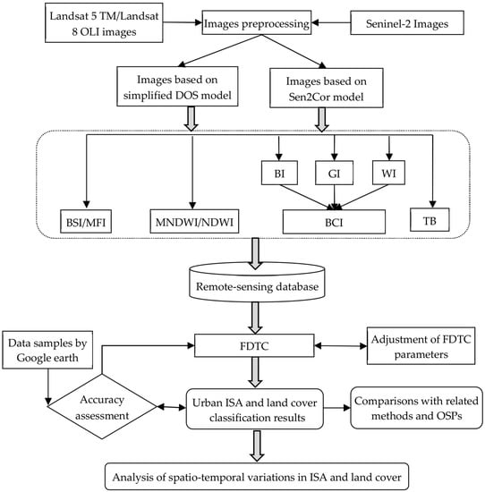 Figure 2 shows the research framework, which consists of the following major parts: (1) simplifying the original DOS model; (2) correction of atmospheric effects by using the DOS model with Landsat 5 and Landsat 8, the sen2cor model with Sentinel-2 images, and then creating a remote-sensing database; (3) developing FDTC to mapping ISA and land cover; (4) evaluating the accuracy and comparing with related methods and OSPs; and (5) analyzing variations in ISA and land cover.