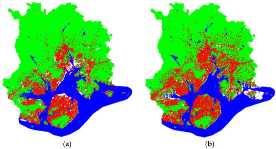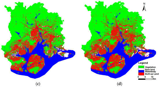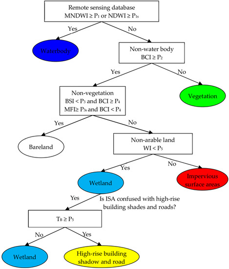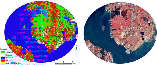 Figure 3 shows the FDTC method for mapping ISA and land cover types based on multiple features. Our research goals and field survey indicate that the land cover classes in the study area can be first categorized as six classes and further merged into four classes. The six classes involve vegetation, ISA, water bodies, bare lands, wetlands, and high-rise building shadows mixed with little roads (HSR). Water bodies include seas, reservoirs, lakes, and rivers. Wetland includes beach land, marshland, ponds, and maricultural areas of the inner bay. When the study area’s land cover is examined, the water bodies and wetlands are combined, as are ISA and HSR.