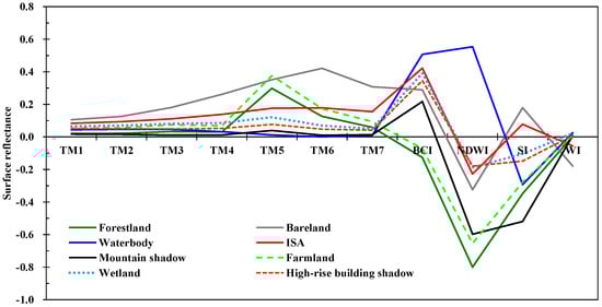 Spectral response curves of various land-use and land-cover types in Xiamen City in 2021.