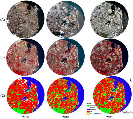 ISA is a typical land cover in cities, and new techniques for mapping ISA have emerged in recent years. Xu [29] used NDISI from Landsat ETM+ images to extract ISAs from the urban area of Fuzhou City, China. Waqar et al. [30] designed NBAI to extract bare soil and built-up area from Landsat 5 TM imagery. Bouzekri et al. [31] applied the built-up area extraction index (BAEI) to extract ISA from Landsat 8 OLI images of Djelfa, Algeria. As-syakur et al. [32] applied EBBI from Landsat ETM+ images to map built-up and bare land areas in Denpasar on Bali Island, Indonesia. To delineate the ISA in Thessaloniki City, Greece, Kaimaris et al. [33] developed the BUI, which combines the RED, SWIR1, and SWIR2 bands of Landsat ETM+. Bouhennache et al. [34] introduced a built-up land features extraction index (BLFEI) to extract ISA from Landsat 8 imagery in Algiers City, Algeria. Kebede et al. [37] found that NBAI was more accurate than other indices for extracting ISAs from Sentinel-2A data in Addis Ababa, Ethiopia. Finally, Deliry et al. [38] evaluated the supervised object-based nearest neighbor (OB-NN) classification method for extracting urban ISAs from Sentinel-2A data.