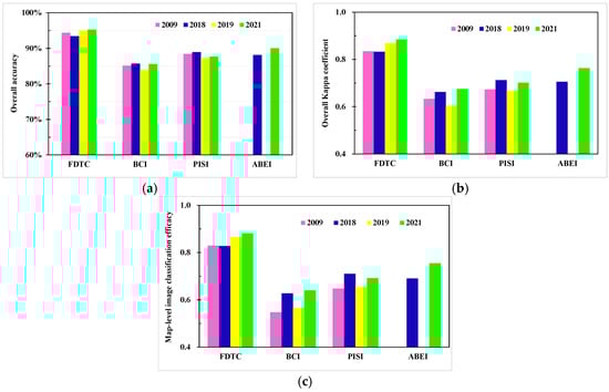 In order to compare the performance of the proposed FDTC with those of other indices, the three indices BCI, ABEI, and PISI were applied for the four images with three sensors, leading to various ISA maps.