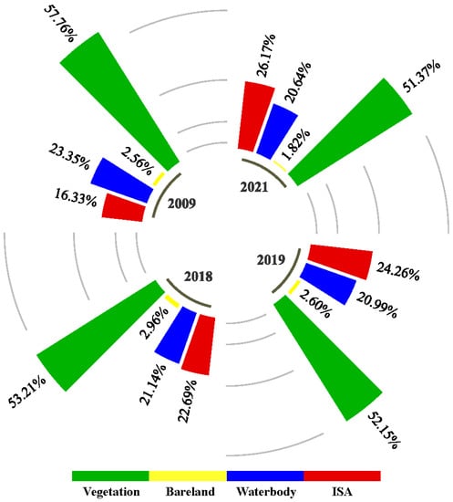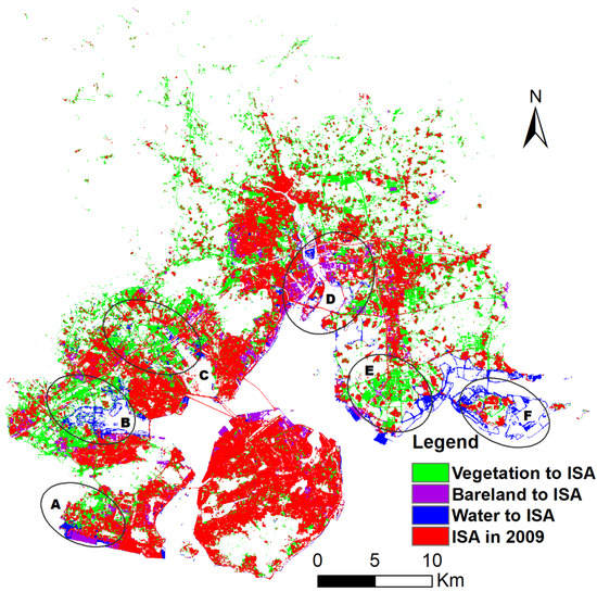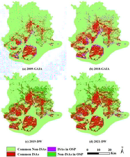 The past 40 years have witnessed significant changes in land use and land cover [1], the most significant of which are characterized by an expansion of impervious surface area (ISA) that replaces the natural vegetation-dominated landscapes [2]. ISA refers to the various impermeable man-made surfaces, such as buildings, roofs, roads, squares, and parking lots, which are mainly constructed from concrete, asphalt, metal, and glass [3]. Given the increasingly concentrated population and high level of economic activity, ISA has emerged as a major indicator of urbanization [4]. Moreover, ISA is an important indicator of environmental quality [5]. In recent years, the worldwide expansion of urban ISAs at an unprecedented rate has resulted in serious urban environmental problems, such as the exacerbation of urban heat islands [6,7], urban heat waves and their related adverse impact on human health [8], increased risk of urban floods [9], and worsening urban water quality including extreme thermal pollution of water bodies [10], all of which combine to alter biological evolution on a global scale [11]. Consequently, timely and accurate monitoring of ISAs is critical to combat climate change and hydrological cycles and to optimize urban planning, environmental protection, and sustainable urban development [12,13,14].