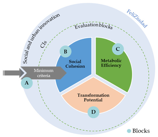 The proposed sustainability assessment system is organised in three blocks, each covering a potential area of impact of a sustainable CI: metabolic efficiency, social cohesion, and transformational potential, allowing us to address social, environmental, economic, spatial, and urban metabolism aspects. In addition, similar to the TESS system [40], a fourth domain was included, which is not scored but serves to filter those initiatives that meet the minimum evaluation criteria, as detailed in Section 4.1.1.