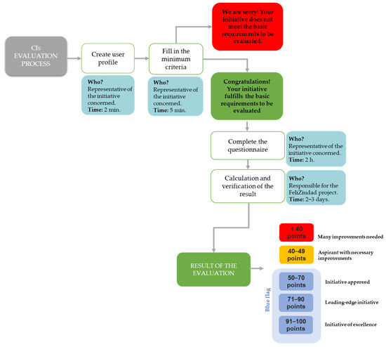 The evaluation workflow is structured in a series of steps that require the intervention of a key actor of the initiative or a key actor of the FeliZiudad project. Figure 3 details the steps to carry out this evaluation. In the data entry process (create user profile and fill in the minimum criteria), a person in charge of the initiative will fill in the data, which will take 2 min and 5 min, respectively; if the initiative complies with the minimum criteria detailed in Section 4.1.1 “Block A. Minimum criteria”, the person in charge of the initiative will be able to fill in the questionnaire corresponding to blocks B, C and D, which will take 2 h (this time corresponds to the questionnaire of 119 questions); from this moment on, a whole validation process will be carried out by an external evaluator who will check the veracity of the information entered in the questionnaires through the documentation provided by the initiatives.