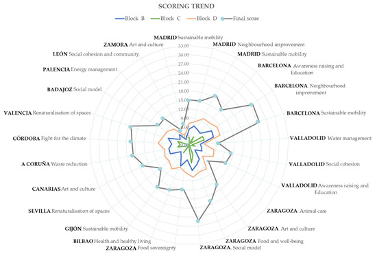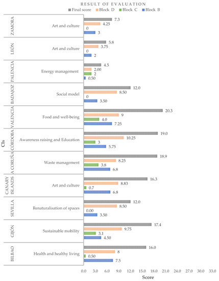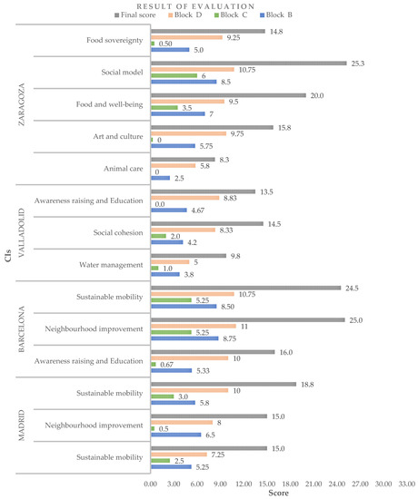 The presented evaluation system was developed based on the in-depth analysis of existing evaluation systems, with special reference to three international proposals. Moreover, the system was designed within the framework of a collaboration agreement in Spain, focusing on the evaluation of Spanish CIs. However, although this proposal takes into account European references in its development, it is intended to be applicable to all types of CIs. Indicators with their universality, in most cases, can allow quantifying this aggregate contribution to the overall sustainability of a neighbourhood, but it is interesting to evaluate the sociopolitical context of the environment where the initiative is developed as an input to the process of identifying barriers and opportunities that can promote this social innovation [55]. For example, it may happen that in some countries, public policies are not oriented to promote and support this type of participation or that citizens are not aware or do not have the means to implement them. Another aspect to consider is the adaptation of the catalogue of questions depending on the reality of the initiative and its environment, i.e., it does not make sense to ask about waste management in a country where this is very well solved, but rather to focus on those sensitive aspects of the city.