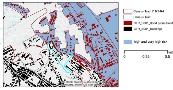 Identification of buildings exposed to flood risk (very high and high level). One randomly selected census tract is lined with light blue tract.