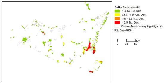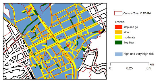 Roads intersecting areas of very high and high risk were thus selected. In order to attribute an overall indicator of traffic condition to each census tract, the following indicator was calculated:
