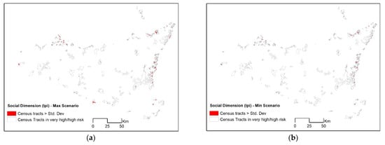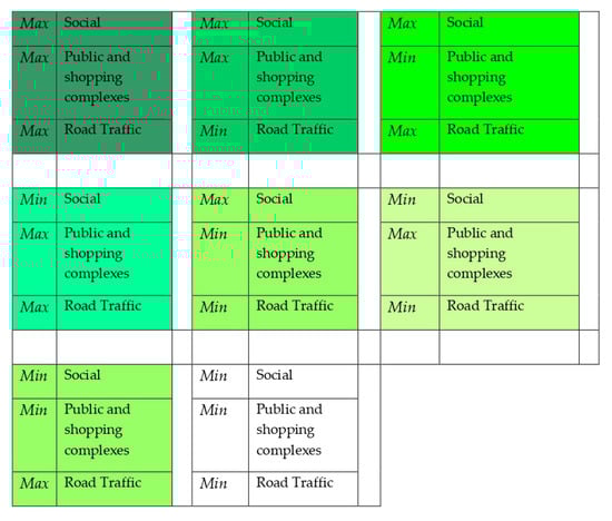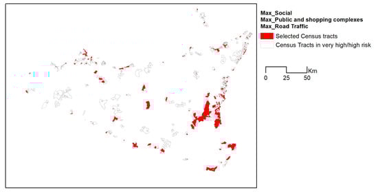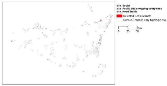 This approach is summarized in Figure 5, reporting all different combinations of values of the three EXVUL dimensions (as reported in Table 1). For example, the scenario (max_Social, max_Public and shopping complexes and max_ Road traffic) includes those census tracts belonging to the Max scenarios previously identified for the three EXVUL dimensions (Table 1). This scenario results in the highest number of census tracts because it follows additive criteria in the selection of census tracts. In contrast, the scenario (min_ Social, min_ Public and shopping complexes and min_ Road traffic) includes census tracts belonging to the Min_scenarios for the three EXVUL dimensions. All other scenarios are similarly identified by different combinations among Max and Min scenarios.