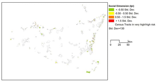 Although census tracts represent the geographical units with the highest possible resolution, there are some situations where they do not represent high levels of EXVUL in the best way. This typically happens where census tracts in rural areas intersect areas of high risk to a limited extent, but the entire census tracts are considered under hazard. Though this situation could be inaccurate from a geographical point of view, it depicts a more prudent scenario of attention to the intersected census tracts.