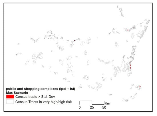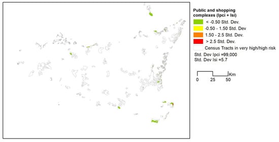 To estimate the quantity of such public buildings, we used a simple indicator accounting for the areas covered by public buildings, schools, religious, social and sport facilities (Formula (5)) and the number of shopping complexes (Formula (6)). Both these indicators have been calculated in the census tracts that intersected the areas at very high (R = 4) and high risk (R = 3) (Figure 4).