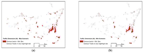 Variables considered in the population and infrastructure dimensions had a greater impact than variables of urban environment dimension: derived from census tracts, variables of populations are sampled and available for the entire region, and traffic information is also available for almost all type of streets (see Section 2.3.2). Variables of the urban environment have a much more scattered geographical extent due to their nature (Section 2.2), resulting in a general lower number of census tracts with high EXVUL. This difference in relevance should be taken into account when selecting suitable mitigation actions.