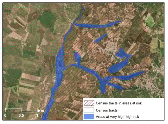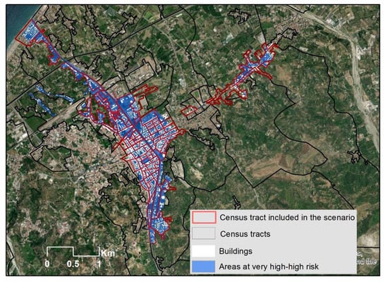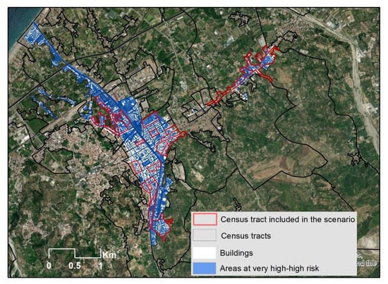 In the current study, the following geo dataset was used. Census tracts from the 2011 national census were available as a polygonal shapefile, with associated socio-demographic attributes. Census Tracts were considered as the reference spatial units for all further analysis. The primary source for delineating regional flood hazard and risk were the maps by the Regional River Basin District authority [37]. Maps depict the spatial extent of the areas at flood risk, based on an assessment method where the damage is a function of the combined exposure and vulnerability. Only areas at high and extremely high risk of flooding were investigated. In these areas, valued societal elements such as people and buildings might potentially be affected by high and extremely high adverse consequences caused by flood hazard associated with the 50-year, 100-year flood and 300-year flood scenarios (Figure 1 and Table S1).