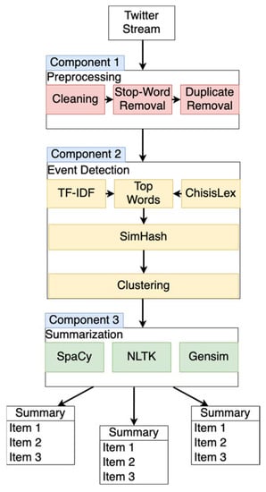 The system we propose in this work consists of three main components that work together as follows. The first component involves loading and sorting data from the Twitter API. The data loaded in this way are first cleaned of usernames, hashtags, and other so-called stop words via a cleaning process. This is followed by the operation of the event detection and clustering module. At this stage, the previously cleaned data are assessed and rated using a term frequency–inverse document frequency algorithm and checked against a Dictionary containing unique disaster-related words. Simultaneously every tweet is hashed using a sophisticated hash function. Afterward, highly ranked data are clustered. Finally, the data are summarized. The system uses the Twitter API to preprocess simple filtering tasks. To achieve this, only relevant keywords, hashtags, and locations are tracked and retrieved from the Twitter API. The data are always fetched within a time window for processing. In the course of this work, the data from such a time window are called a chunk. A chunk contains all tweets from a given time window. One of the goals of the modules of our system is to process the messages of the last time window in the given time window. The following section describes the components of the system, as depicted in Figure 2.