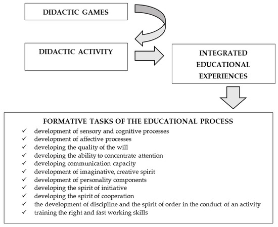 Considered a method of learning through practical action but also an active method of training, the didactic game offers integrated educational experiences through which formative tasks of the educational process are achieved [13]. Figure 2 presents the formative tasks of the educational process achieved by integrating games into teaching activities, as identified by Pânișoară, 2022 [13].