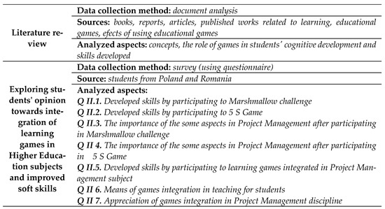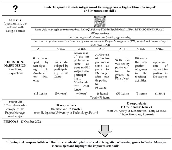 The participants in the study answered the questions of the same questionnaire; these were students from two faculties belonging to a university in Poland and a university in Romania (Bydgoszcz University of Science and Technology—Faculty of Management, and University of Life Sciences “King Mihai I” from Timisoara—Faculty of Management and Rural Tourism). The number of participants in the study was 103 students. The discipline of Project Management was chosen because it was considered to be a discipline to which the integration of didactic games is suitable in order to set the theoretical notions taught in the course [42,65]. The 103 students who participated in the study went through the discipline of Project Management and participated in at least two games applied in the teaching activities of the discipline (Marshmallow Challenge and 5S Game).