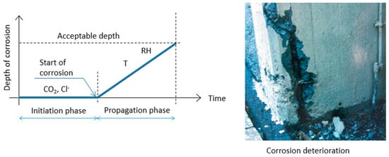 The passive film can be damaged or even disappear either because the alkalinity of the concrete is not maintained(pH < 9), mainly induced by the carbonation of the cover, or because of the presence of a high concentration of chlorides in the cover [37]. The time between concreting and the disappearance or damage of the passive film is called the initiation time, see Figure 1.
