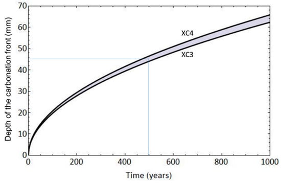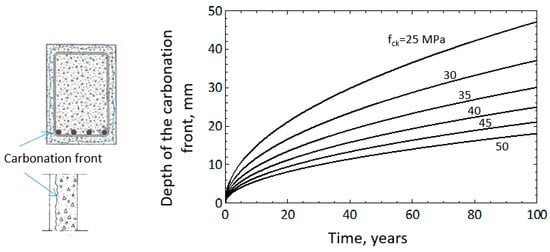 Several mathematical models have been created to describe the evolution of the carbonation front, such as [19]. The following expression (2), extracted from Annex 12 of the Spanish Structural Code [35], provides mean values of the evolution of the depth of the carbonation front over time: