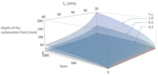 Figure 3 shows that the compressive strength of concrete has a considerable influence on the depth of the carbonation front. From a comparison of the three surfaces in Figure 3, it is evident that when there is a higher risk of corrosion (i.e., for the higher value of cenv), the influence of concrete compressive strength is greater.