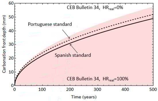 As can be seen in Figure 4, using both the Spanish and Portuguese standards leads to similar values of the evolution of the carbonation depth over time for the most common exposure class [28], and the values given by the Portuguese standard are slightly higher than those estimated by the Spanish Structural Code [35] for each period of time. Moreover, the carbonation depths obtained from both standards lie within the range defined by the CEB Bulletin 34 [36].