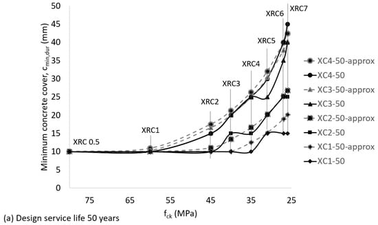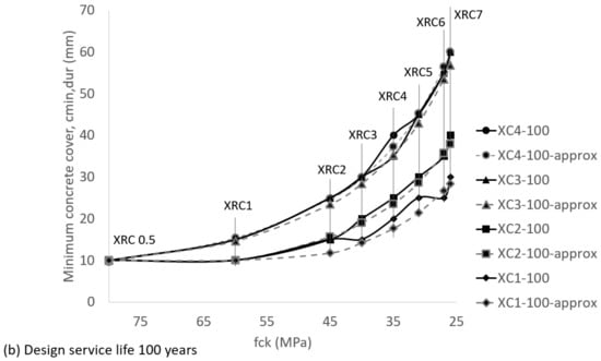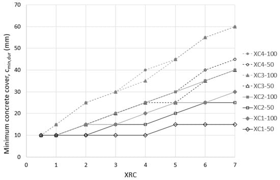 Two design service life values are considered in prEN 1992 [34], 50 and 100 years, and the values of cmin,dur are presented in a tabular format. The values given by prEN 1992 are shown in Figure 5, where XC is the exposure class for carbonation and XRC is the resistance class against corrosion caused by carbonation. To facilitate the identification of the different exposure classes and service design lives, discrete values given by prEN 1992 [34] have been connected with lines in Figure 5.