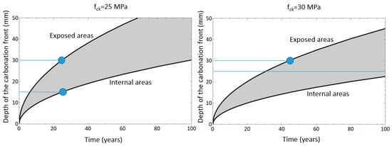 Camino de Ronda is the longest street in Granada, and it is also one of the most densely populated areas of the city. Along this street, reinforced concrete buildings of various ages can be found. As a preliminary approach, based on the regulations in force during the construction of the buildings, we have considered, as a working hypothesis, that the characteristic strength of concrete is 25 MPa in concrete manufactured up until 1970, and 30 MPa from 1970 onwards. The concrete cover in the exposed areas have been assumed to be 30 mm. The concrete cover in the internal areas have been assumed to be 15 mm for buildings from before 1970 and 25 mm for later ones. According to Equation (3), the initiation time is 25 years for pre-1970 buildings and 44 years for post-1970 buildings, see Figure 8. These premises are the worst-case scenario, given that a concrete structure is always protected from environmental factors, by plaster coatings, paint, bricks, etc.