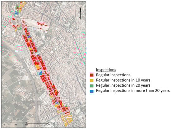The results obtained have been summarized in Figure 9, which indicate when periodic inspections for the buildings of Camino de Ronda are necessary based on the estimated end of the initiation times.