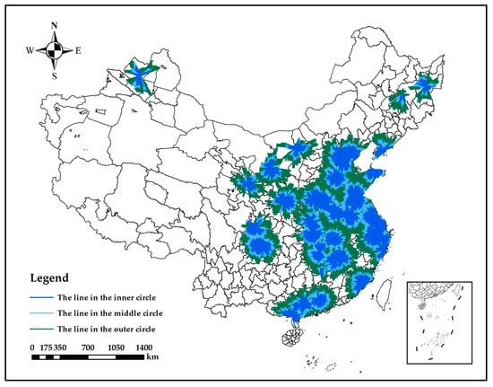 In this study, the inner, middle, and outer circles were set at 150 km, 200 km, and 300 km, respectively. Among them, the inner circle radius is set by taking the average distance from each UMPB to the nearest provincial administrative center, which represents the satisfaction of the basic demand for urban mineral recovery. The setting of the middle circle radius is referred to the setting of the maximum service radius in the literature [34]. Considering that the road network distance between two points is generally 1–2 times that of the Euclidean distance, the radius of the outer circle layer is set to 300 km. The classification of circles based on the distance of the road network is shown in Figure 3.