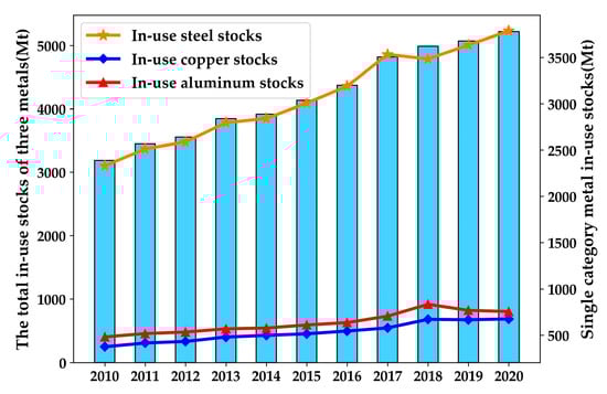 Metal in-use stocks play an important role in the metabolism of socioeconomic systems, which are closely related to human life and are important carriers of housing, transportation, etc. When products that exist in society reach the end of their useful lives, the materials contained in them can be recycled and reused. Consequently, the question of what amount of urban minerals in a country or region can be exploited, and when to exploit them to maximize the benefits, is a pressing one. Estimating the metal in-use stocks and clarifying their spatial and temporal distribution can help assess their future development potential and can guide the orderly recycling of scrap metals [6].