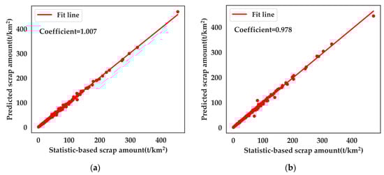 Then, a multiple linear regression model between scrap and these three variables was developed by region. Data from 2010 to 2018 were used as the training set for the model, and data from 2019 and 2020 were used as the test set for the model. We compared the statistically obtained data with the data predicted by the model (Figure 11). The results showed that the goodness-of-fit R2 was 0.996 with a coefficient of 1.007 for 2019 and that R2 was 0.997 with a coefficient of 0.978 for 2020. Most of the points are more uniformly distributed along the 1:1 line. This also implies that the multiple linear regression model constructed in this study is robust at grid scales.