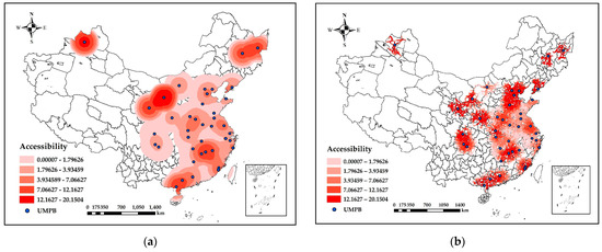 The results of the accessibility classification for the outer circle are shown in Figure 15. With this service radius, the coverage area based on Euclidean distance accessibility was already the vast majority of eastern China and part of western China. Of these, the achievable values are mostly average in central China, while the achievable values are higher around the UMPB in western and northeastern China. The road network distance accessibility distribution in the outer circle was more similar to the Euclidean distance accessibility distribution in the middle circle. Both of them mainly cover most of the eastern part of China. However, the accessibility range of the road network distance was more irregular.