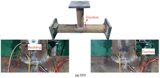 From the experimental results above, there are two failure modes, with those being the main pipe fracture and joint area compression-bending failures. In order to clarify the failure mechanisms of the two typical failure modes, the ST3 specimen is considered to be the typical specimen for fracture failure and the ST5 specimen is considered to be the typical specimen for joint area compression-bending failure. Figure 17 shows the comparison of the failure modes between the two typical specimens from the FEM results and the experimental results. It can be seen that the failure modes between the FEM and experimental specimens are generally consistent with each other.