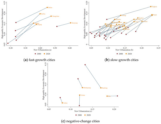 First, the study utilizes the entropy method to measure the two indicators of new urbanization and the level of high-quality economic development to depict the change characteristics from 2000 to 2020. The 34 sample cities are then classified into three categories: fast-growth (Figure 2a), slow-growth (Figure 2b), and negative-change (Figure 2c). Figure 2a displays the fast-growth cities of new urbanization and high-quality economic development in Northeast China, mainly comprising Harbin, Daqing, Changchun, Shenyang, Dalian, and Anshan. During the period from 2000 to 2020, the level of new urbanization and economic development of six cities improved by more than 0.2 points, exhibiting significant growth in comparison to other prefecture-level cities that function as regional core cities. As shown in Figure 2b, among the 23 slow-growing cities, except for Yingkou, Panjin, Benxi, and Fuxin, the score growth was less than 0.1 from 2000 to 2020, with most cities having low levels of new urbanization and economic development. In 2000, Heihe, Shuangyashan, Hegang, and Qitaihe in Heilongjiang Province, and Baicheng, Songyuan, and Siping in Jilin Province had very low levels of high-quality economic development, which still generally lag behind most cities in Liaoning province by 2020. Cities with faster growth rates are mostly concentrated in Liaoning Province. Figure 2c presents the five cities with negative changes. Notably, among the cities with negative change, Mudanjiang, Dandong, and Suihua exhibit an increase in the level of new urbanization but a decrease in the level of high-quality economic development. In contrast, Yichun in Heilongjiang Province displays a relatively stable level of new urbanization while experiencing an improvement in high-quality economic development. Meanwhile, Jilin in Jilin Province maintains a constant level of high-quality economic development while observing a decline in the level of new urbanization.