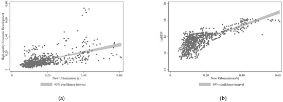 To examine the correlation between new urbanization and high-quality economic development, a scatterplot is plotted (Figure 3a). In order to verify the stability of the correlation, we replace the variable of high-quality economic development with LnGDP and plot the changes of new urbanization and LnGDP (Figure 3b). As seen in Figure 3, new urbanization and economic development exhibit a strong positive correlation, which serves as the premise and basis for the empirical evidence presented in this paper.