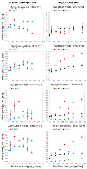 Figure 1 (lowest to the left) shows the cumulative amounts of ryegrass harvested during the three harvests (180 days). Growths varied from 0.15 to 0.5 g d.m./pot for the MF and from 0.20 to 0.4 g dm/pot for the KW, with maximums reaching ca. 0.42 g d.m./pot at 70 kg N/ha for the MF and 0.38 g d.m./pot at 170 kg N/ha for the KW. The KW-based fertilizer has reached the response plateau for doses larger than 170 kg N/ha without a clear overfertilization effect, as growths were still moderately high (0.35–0.40 g d.m./pot). MF at these doses provided ca. 40–60% smaller biomass increments amounting 0.25 g d.m./pot for dose 170 kg N/ha and dropping rapidly to 0.15 g d.m./pot for each increasing dose. So, there is a larger buffer capacity in the case of KW to apply it with higher dosages without harming plants.