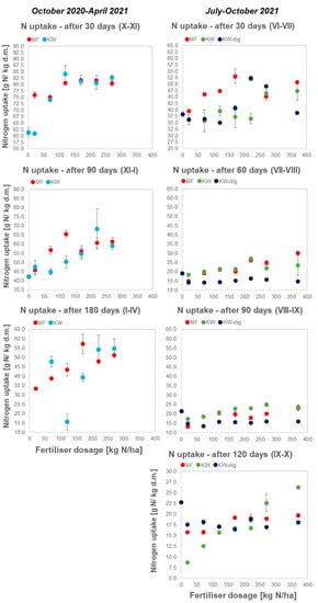 The first month (June/July) provided ca. 10–20% better N uptake in plants fertilized with MF reaching 55 g N/kg dm at 170 kg N/ha dose. Later the growths were similar for KW–dig and MF, reaching 52 g N/kg d.m. at 220 kg N/ha. KW provided similar uptakes (50 g N/kg d.m.) but only at 270 kg N/ha and greater. This also shows the shift of response maximums to higher application dosages for organic fertilizers as compared with mineral ones, at the same time proving greater N availability from anaerobically digested materials (KW–dig) than from undigested ones (KW). The next months (i.e., after 60 days) provided an N uptake maximum of 30, 25, and 15 g N/kg d.m. for MF, KW, and KW–dig, respectively, and 22, 25, and 15 g N/kg d.m. after 90 days for MF, KW, and KW–dig, respectively. This trend shows that undigested KW leads to uptakes comparable to MF at later times, whereas digested KW–dig provided steady and lower uptakes over the wide range of doses. In the last month (after 120 days), KW again provided up to a 20% greater uptake at higher dosages (>170 kg N/ha) than MF and KW–dig (their uptakes were generally lower and oscillated for about 15–20 g N/kg d.m., with MF being slightly greater).