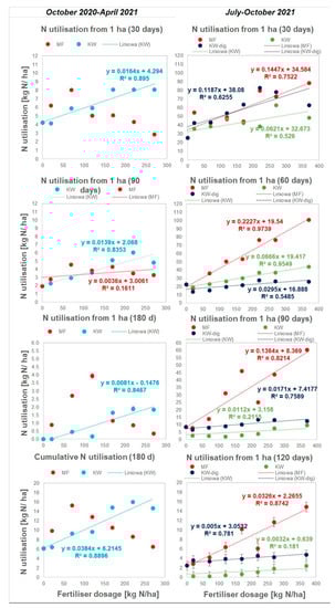 Under warm conditions, the situation is the opposite, meaning that MF always provided better N use than KW and KW–dig. The use of N from soils amended with KW–dig (30–80 kg N/ha) was comparable with the MF scenario (30–90 kg N/ha) only during the first 30 days, i.e., at the beginning of the test, while the KW scenario led to a lower use (30–60 kg N/ha). The following months of growth resulted in the increasing levels of N use with an increased MF fertilizer application rate: 20–100 kg N/ha, 10–60 kg N/ha, 2–15 kg N/ha for 60, 90, and 120 days, respectively. N use by plants in these months grown in the soil amended with KW–dig/KW were around 4/3 (after 60 days), 6/10 (after 90 days), and 4/7 (after 120 days) smaller than N use in the MF scenario. Apart from the second month of growth (60 days), the application of anaerobically digested KW–dig led to around a 50–150% greater N use than undigested KW, showing the highest differences in the first month (30 days) and fourth month (120 days). For the warm season calculation of AAE, moderate linear regression was possible for MF (R2 = 0.75–0.97), while poor linear regression was possible for KW–dig (0.63–0.78, excluding growth at 60 days). A good linear regression for the response to N use in the application of KW was found only after 60 days (R2 = 0.95).