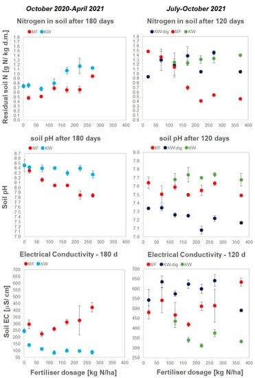 The residual N content in the soil was generally higher for KW and KW–dig (from 0.9 to 1.4 g N/kg d.m.) than for MF (from 0.4 to 1.5 g N/kg d.m.) and even up to three times higher at 220 kg N/ha and more. The soil pH was quite stable across application rates and was on average 7.6–7.8 for KW, 7.5–7.6 for MF, and 7.1–7.3 for KW–dig. The EC varied after application of KW–dig from 550 to 650 µS/cm and increased after MF application from 400 to 600 μS/cm (especially after 220 kg N/ha and more), while it decreased from 450 to 300 μS/cm for KW, which was also observed in the cool season. Again, significant growths of EC were only observed for MF applications (Figure 4).